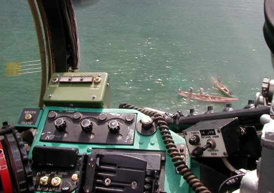 Low over fishing boats and a village.