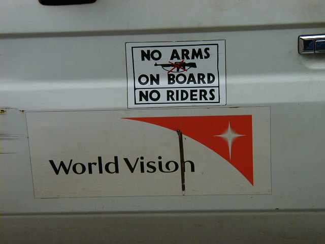 Many NGOs sport similar "No Arms" stickers in an attempt